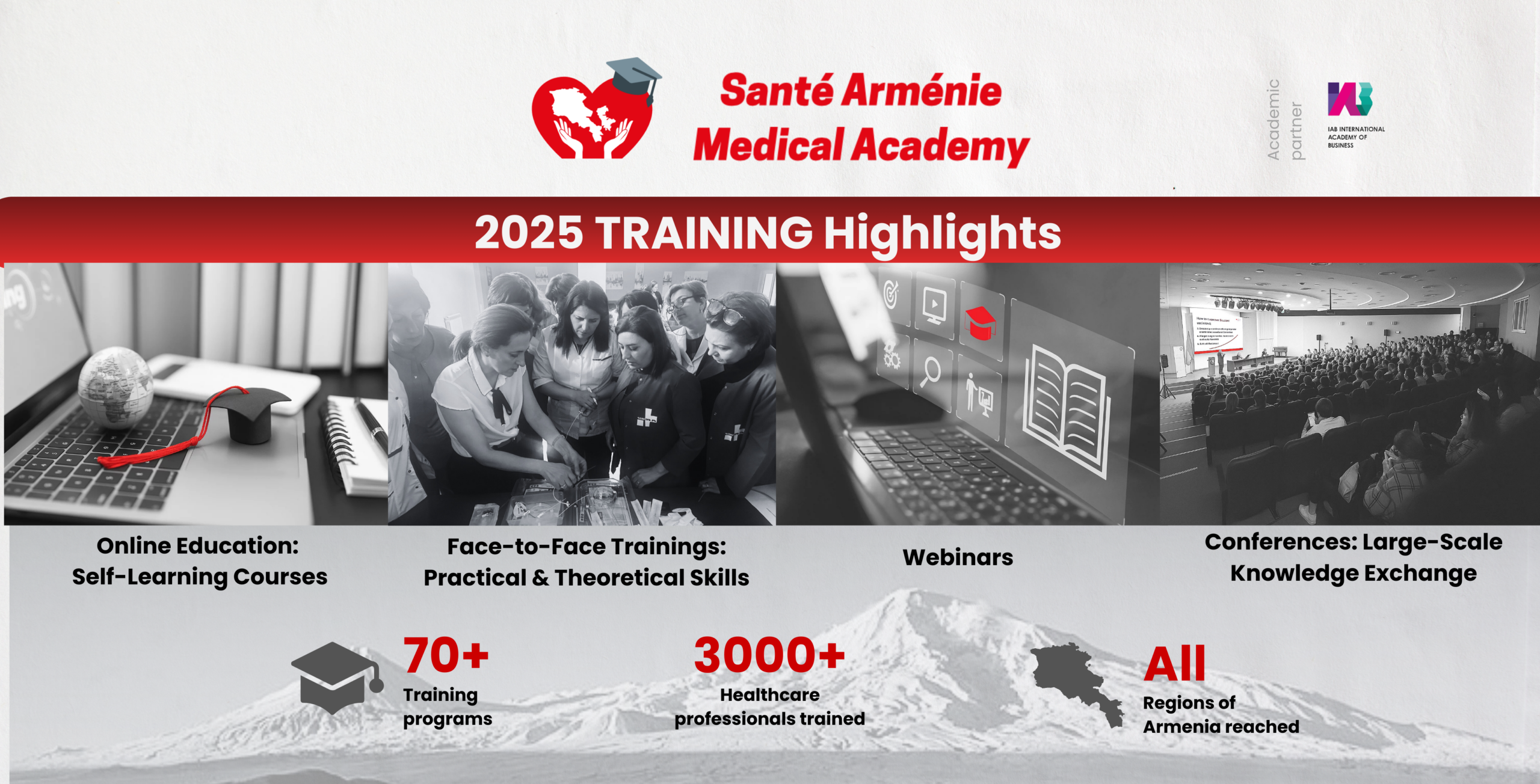 2025 թվականին «Santé Arménie» բժշկական ակադեմիան վերապատրաստել է ավելի քան 3.000 մասնագետ ողջ Հայաստանում՝ առցանց դասընթացների, վեբինարների, առկա գործնական դասընթացների և համաժողովների միջոցով, ընդգրկելով բուժքույրական խնամք, շտապ օգնություն, ինտենսիվ թերապիա, քրոնիկ հիվանդությունների կառավարում, թոքաբանություն և իմունային ուռուցքաբանություն։ Մեր կամավոր դասախոսների ջանքերի շնորհիվ հնարավոր եղավ իրագործել պրոֆեսիոնալ կրթական ծրագրեր՝ ամրապնդելով մասնագիտական կարողությունները և հիվանդների խնամքի որակը ամբողջ երկրում։