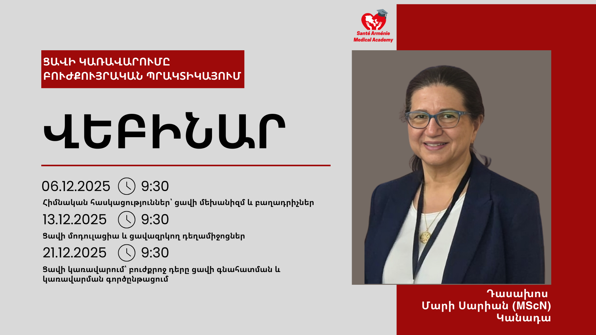 - Ցավի կառավարում՝ բուժքրոջ դերը ցավի գնահատման և կառավարման գործընթացում — 2025 թ․ Դեկտեմբերի 20, ժամը 09:30